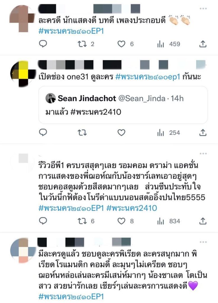 เวรี่กู้ด จนใจฟูมากเว่อร์ สำหรับ การเปิดตัว ละครพีเรียดตระการตา ฟอร์มใหญ่ “พระนคร๒๔๑o” ทาง ช่องวัน31 เรียกว่า เปิดตัวอีพีแรก ก็มาครบจัดเต็มทุกองค์ประกอบ โดยเฉพาะ เคมีของพระนางต่างขั้ว “ฌอห์ณ จินดาโชติ” และ “ชาร์เลท-วาศิตา แฮเมเนา” ที่เหมาใจแฟนละครไปชุดใหญ่ กับเคมีความน่ารัก ของ “คุณพระ” (ฌอห์ณ) โปลิศหนุ่ม มาดขรึม กับ “โนรี” (ชาร์เลท) แม่สื่อสายทะเล้น แสนซน โดยเฉพาะสาวชาร์เลท ที่ออร่าความสดใส เปล่งประกายได้ชัด จนแฟนๆ ต่างชื่นชมในฝีมือ ด้านเหล่าตัวตึงในพระนคร ก็ไม่น้อยหน้า ไม่ว่าจะเป็น ป้าจิ๊-อัจฉราพรรณ ไพบูลย์สุวรรณ ในบท “ยายแถม” แม่สื่อฝีปากกล้าตีคู่มากับ แอ๊ว-อำภา ภูษิต ในบท “สา” และ ญิ๋งญิ๋ง-ศรุชา เพชรโรจน์ ในบท “สร้อย” แม่ลูกสายไฝว้ รวมถึงอีกหนึ่งคู่กัด น่ารัก น่าตี พ้อยท์-ชลวิทย์ มีทองคำ และ ปลายฟ้า-ณัชภรณ์ อุ่นสวัสดิ์ ที่ผิดใจกันตั้งแต่แรกเจอ เอาเป็นว่า นักแสดงทีมนี้ยกขบวนออกมางัด ซัดคารมกันไม่ยั้ง ชนิดคม ชัด จัดเต็มทุกอารมณ์ ทั้ง คอมเมดี้ ดราม่า แอ็คชั่น ทำให้ความเป็นพีเรียดของละครเรื่องนี้ ลงตัว ด้วยบทมีความร่วมสมัย ดูง่าย เข้าใจง่าย แต่ยังคงความสวยงามของความเป็นละครพีเรียดได้อย่างสวยงาม ที่สำคัญ ยังแฝงเกร็ดความรู้ประวัติศาสตร์หลายด้าน ไม่ว่าจะเป็น การเข้ามาของ “หมอแบลดลีย์” หรือ โรงชำเราบุรุษ ซึ่งเป็นสถานที่หญิงสาวมอบความสำราญให้กับชายที่มาใช้บริการ และ อาชีพแม่สื่อแม่ชัก กับการจับคู่ชายหนุ่ม หญิงสาว ให้ได้ลงเอย เป็นทองแผ่นเดียวกัน ที่มีมาอย่างยาวนาน