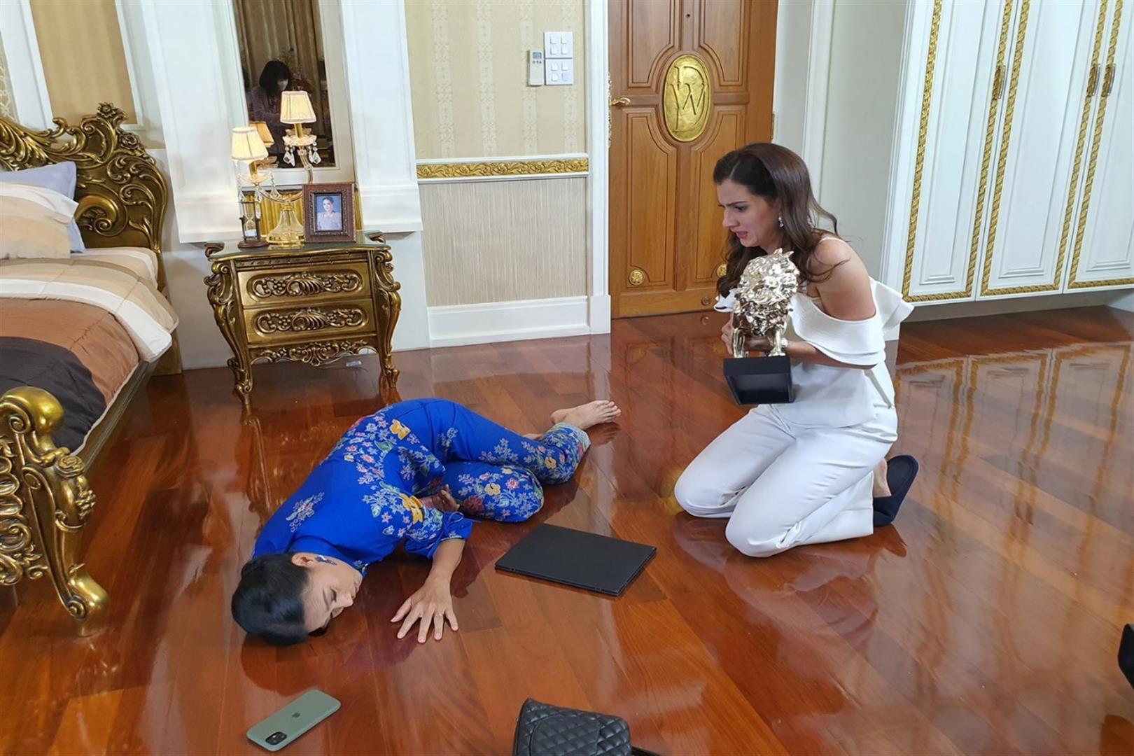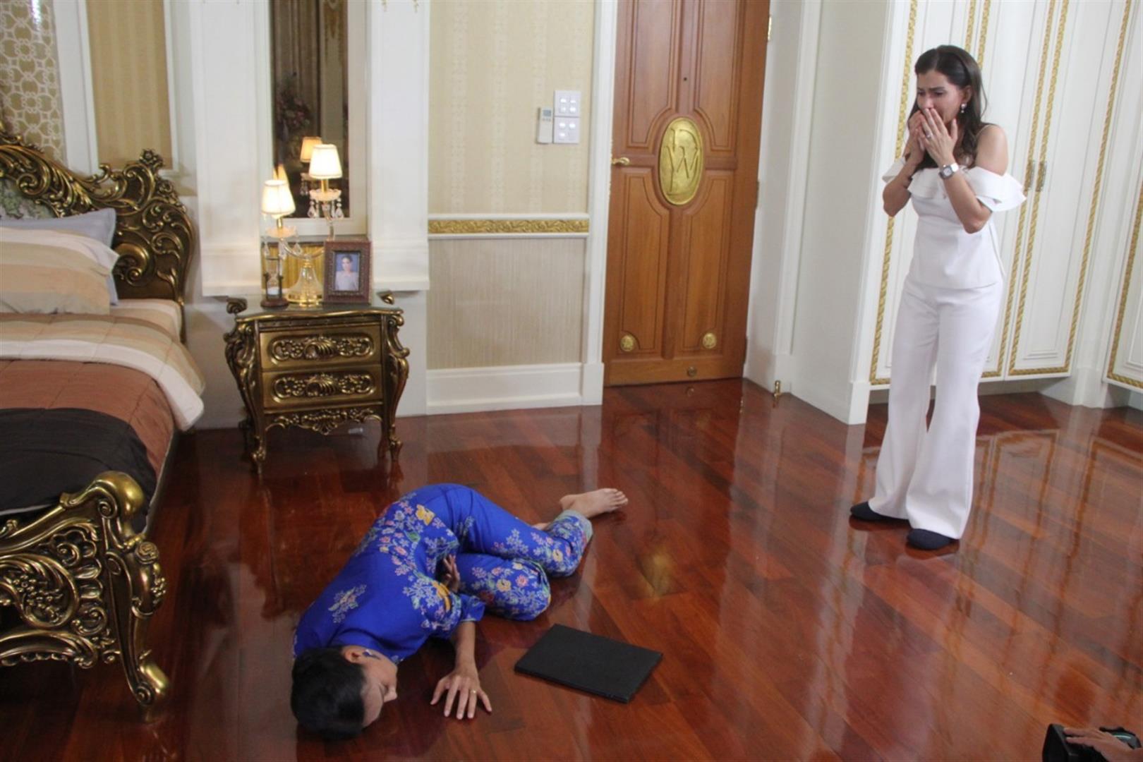 การถ่ายทำฉากนี้ใช้ บ้านม้าทอง ย่านกระทุ่มแบน จ.สมุทรสาคร ซึ่งก่อนถ่าย ผู้กำกับฯ อาต้อย-จารึก ก็ให้ 2 นักแสดงซ้อมก่อน เพราะในฉากต้องมีการฉุดกระชาก แถมต้องเหวี่ยงไปกระแทกกับขอบเตียง จึงต้องมีการซ้อมคิวไปพร้อมๆ กับคิวกล้องด้วย ผลถ่ายไป 2 เทคผ่าน จากนั้นก็เปลี่ยนมาถ่ายเจาะฉาก เอิบบุญล้มหัวกระแทกเตียง งานนี้ก็ต้องใช้มุมกล้องเข้าช่วย แต่ก็ต้องมีการซ้อมก่อน เพราะถ้าพลาดมีเจ็บจริงแน่ ปรากฎว่าตอนถ่าย ผู้จัดคนเก่ง ก็ล้มฟาดร่วงลงพื้นตรงจุดเป๊ะ