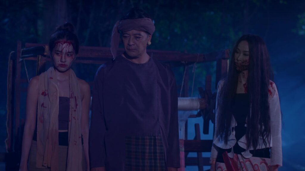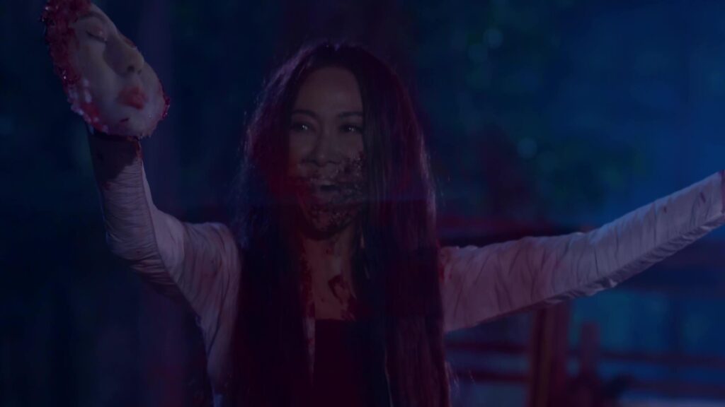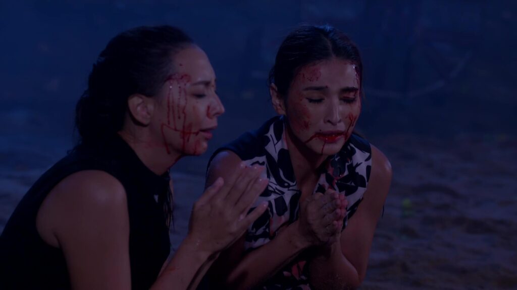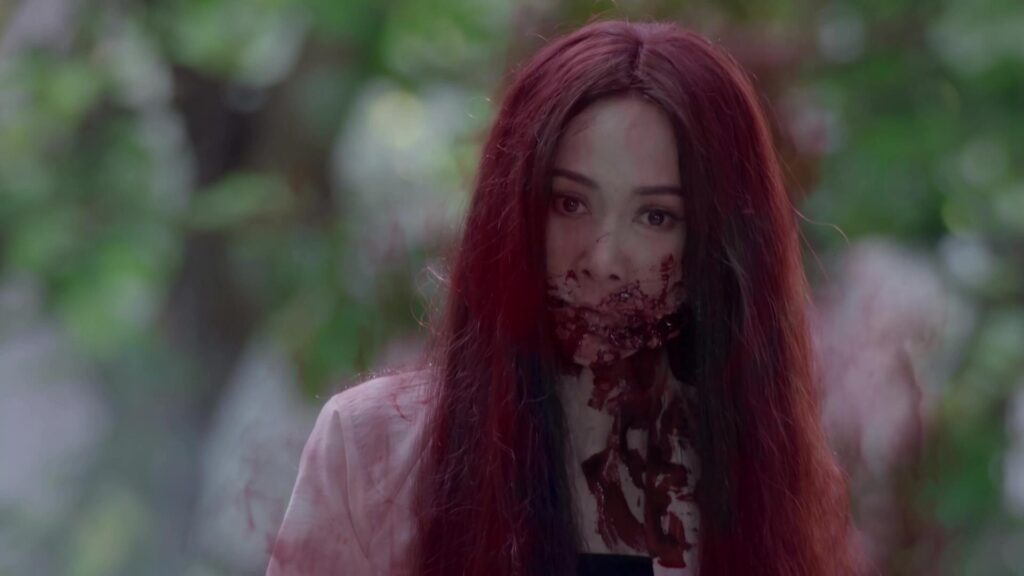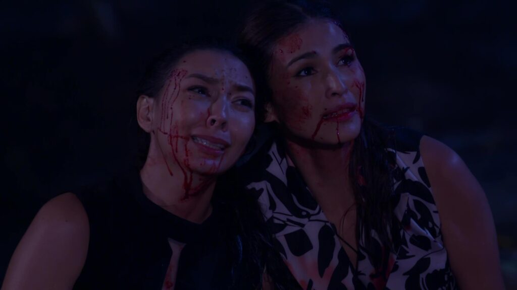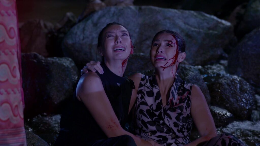 เป็นฉากที่ มินพยู(ยุ้ย) รู้ความจริงว่าสองแม่ลูก อยู่เบื้องหลังแผนชั่วทั้งหมด จึงเกิดความแค้นในใจล่อลวง เลเลยา(คารีสา) และ เลนันทา(โบว์) มาที่น้ำตก มินพยูเล่นงานจนสองแม่ลูกกระอักเลือด และรวมพลเจ้ากรรมนายเวร มาตรึงแขนของสองแม่ลูกไว้ มินพยู ตรงเข้าถลกหนังหน้าสองแม่ลูกออกมา แล้วหัวเราะอย่างบ้าคลั่ง
